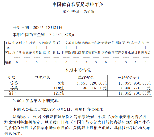 北京技能12月31日,输赢彩第25196期开奖遵守揭晓。本期足彩头奖共开出3注,单注奖金3,351,320元;二等奖开出118注36,515元;任九开929注13,024元。本期输赢彩销量为22,441,878元,任九投注总数为18,905,172元。